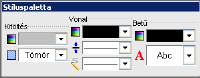 A stíluspalettán adhatjuk meg a kijelölt objektum, tulajdonságait: kitöltő színét, mintáját, a körvonal színét, vastagságát, mintáját vagy a betű típusát, színét.